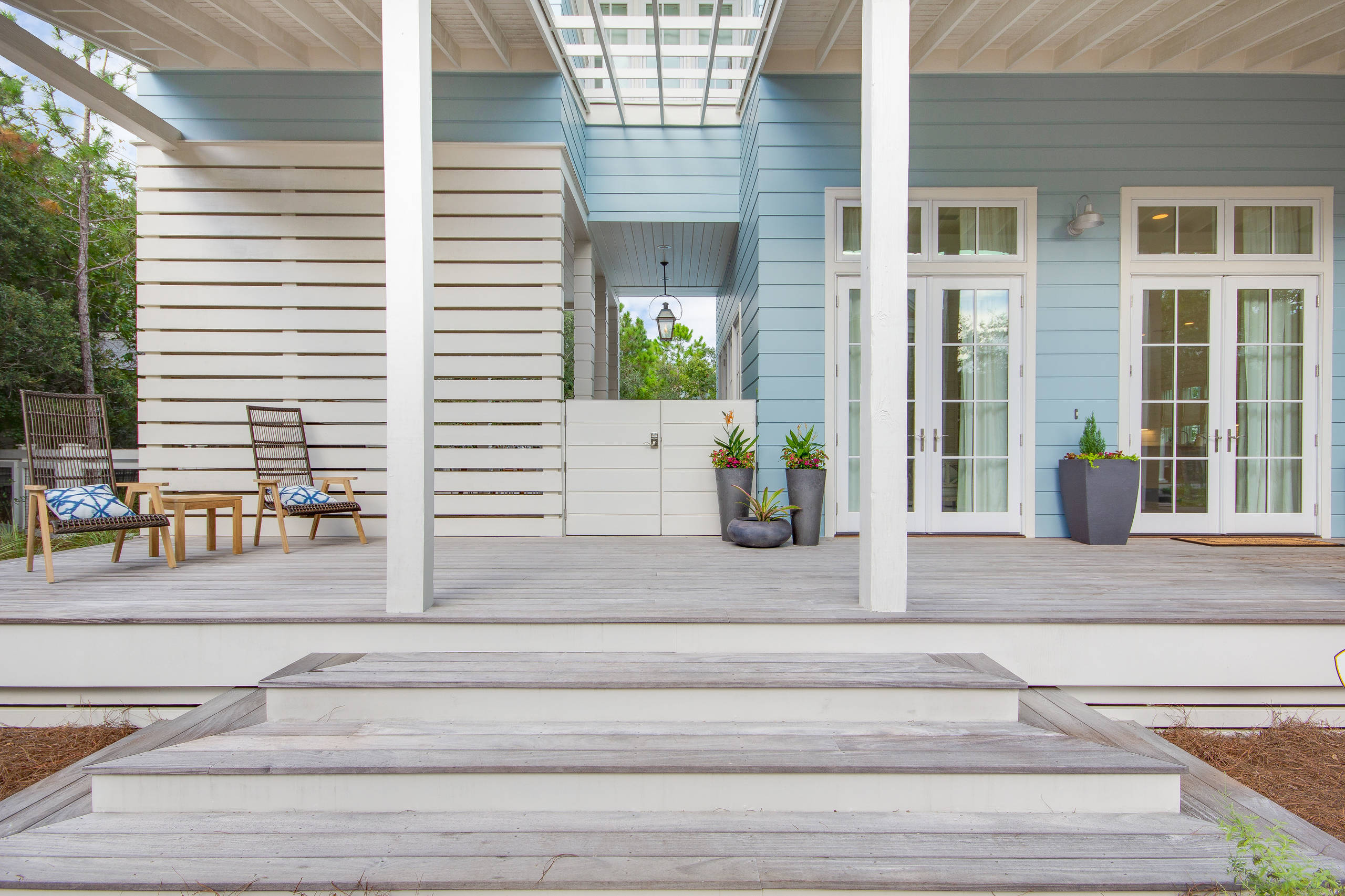 Blue Ceiling Board And Batten French Doors Outdoor Sofa Porch