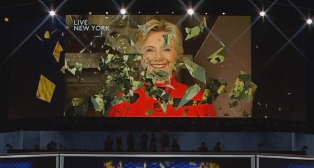 Hillary Clinton Appears On Jumbo Screen After Shattering Glass
